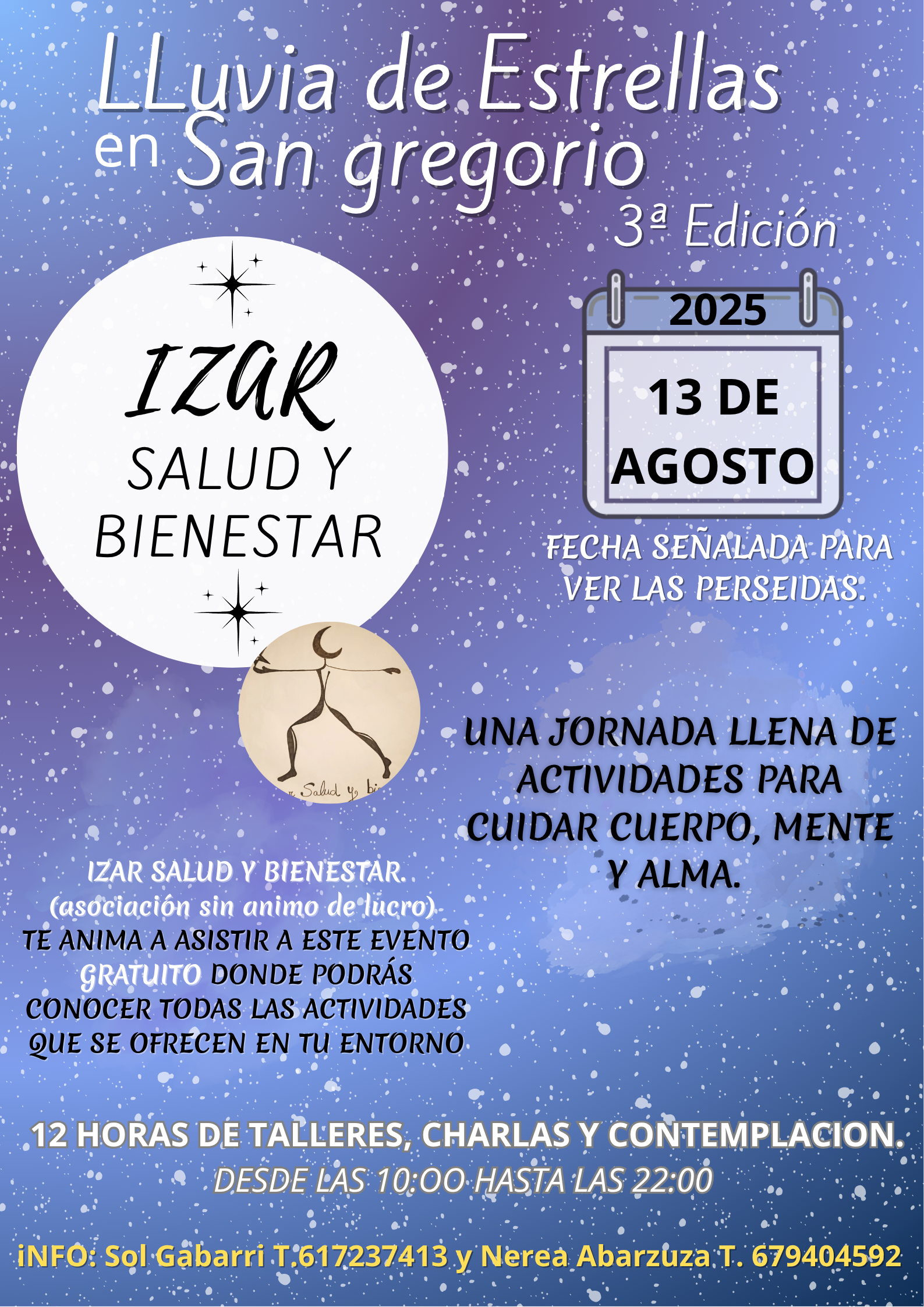 El evento es sin animo de lucro. Nerea Abarzuza, Monica Lopez y Sol Gabarri, somos quienes integramos la junta directiva de la Asociación Izar Salud y bienestar. Estamos trabajando en la organización de este evento, con el deseo de abrir un espacio para la convivencia y el compartir.